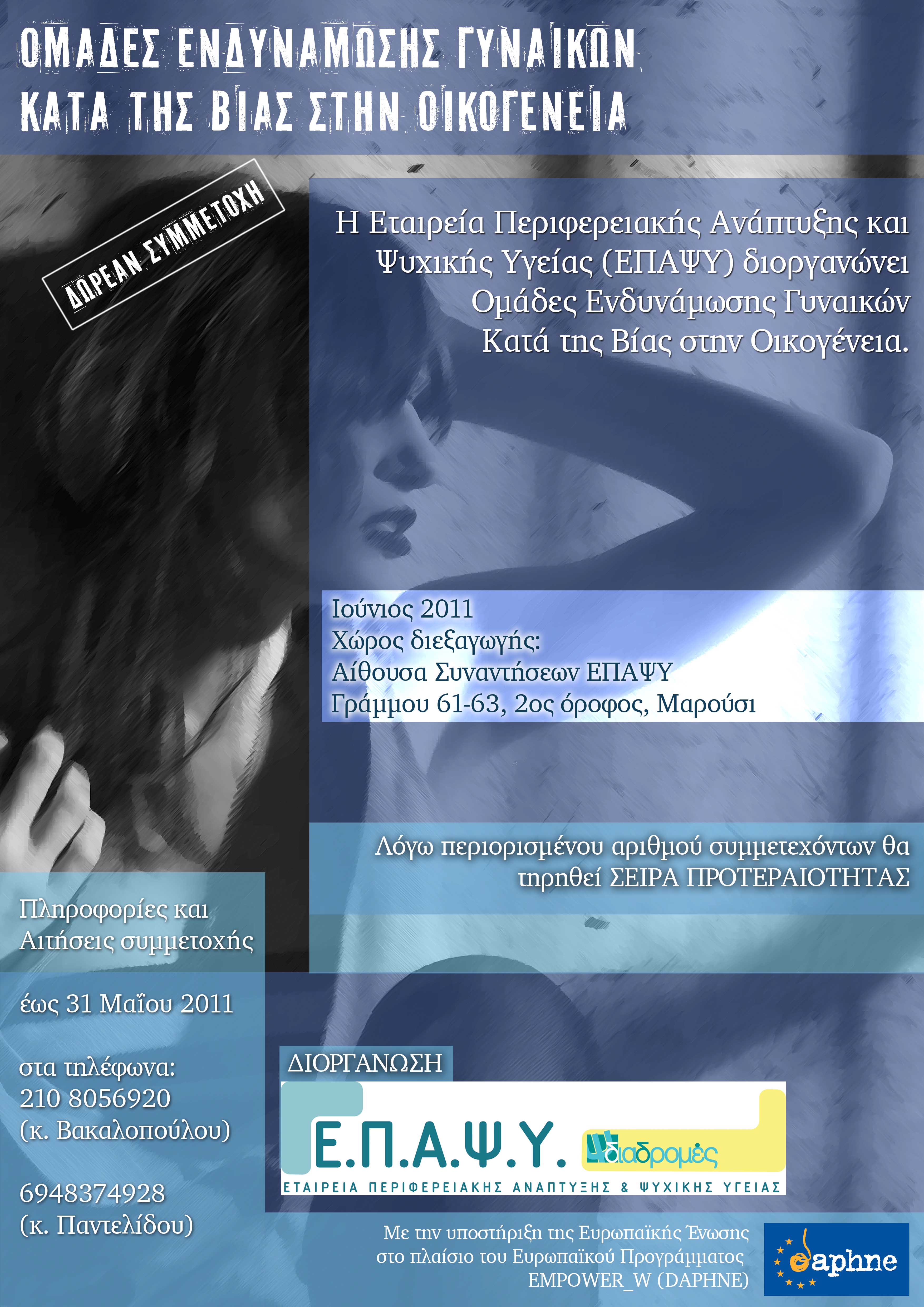 σας ενημερώνουμε ότι τον Ιούνιο 2011 θα πραγματοποιηθούν στα Κεντρικά Γραφεία της ΕΠΑΨΥ ΟΜΑΔΕΣ ΕΝΔΥΝΑΜΩΣΗΣ ΓΥΝΑΙΚΩΝ ΚΑΤΑ ΤΗΣ ΒΙΑ ΣΤΗΝ ΟΙΚΟΓΕΝΕΙΑ, για γυναίκες που έχουν υποστεί ψυχολογική, σωματική ή σεξουαλική βία. Εδώ μπορείτε να δείτε την αφίσα.